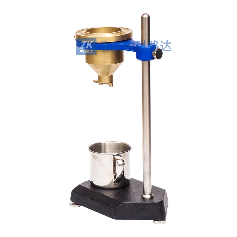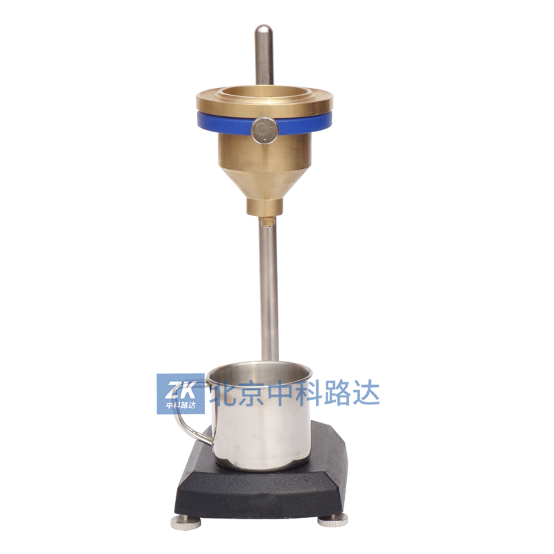 4、將試液注入粘度計時,同時用一手指堵住流出孔,注滿后用一金屬或玻璃平板在杯上刮平,將多余試液刮入粘度計邊緣凹槽內,放好承接杯。