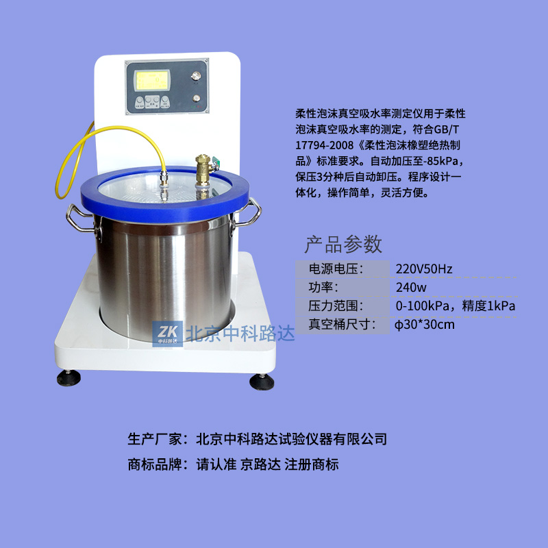 柔性泡沫真空吸水率測(cè)定儀用于柔性泡沫真空吸水率的測(cè)定,符合GB/T 17794-2008《柔性泡沫橡塑絕熱制品》標(biāo)準(zhǔn)要求。自動(dòng)加壓至-85kPa,保壓3分種后自動(dòng)卸壓。程序設(shè)計(jì)一體化,操作簡(jiǎn)單,靈活方便。