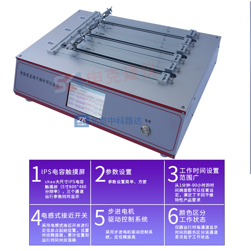 這是一款功能強大的智能型的直線干燥時間記錄儀,可以滿足不同干燥時間特性的樣品的全面分析。帶半球型觸點的劃桿安裝在滑架上。劃桿由滑架帶動,與新涂膜層接觸,由一端開始,在試樣上作縱向移動??赏ㄟ^儀器的“軌跡查詢”功能查看對應(yīng)軌跡的各個干燥階段。它有三個可以單獨設(shè)定任意運行時間的通道(每個通道有兩條工作軌道),符合ASTM D 5895的標準要求。