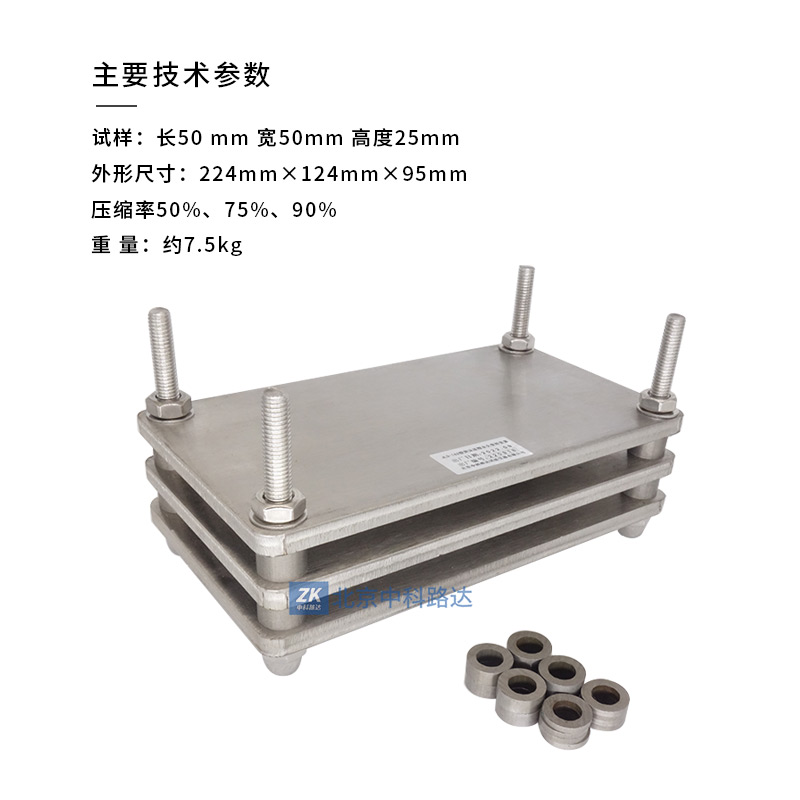 泡沫壓縮永久變形器由平行鋼板、限制器和緊固件組成,符合GB/T 6669-2008 ISO 1856:2000 《軟質(zhì)泡沫聚合材料壓縮永久變形的測定》的要求。在規(guī)定的溫度下,使泡沫材料試樣在一定的時間內(nèi)維持恒定的變形,待試樣恢復(fù)一段時間后,觀察形變對試驗厚度的影響。用試樣的初始厚度與最終厚度之差與試樣初始厚度之比的百分率表示該材料的壓縮永久變形。