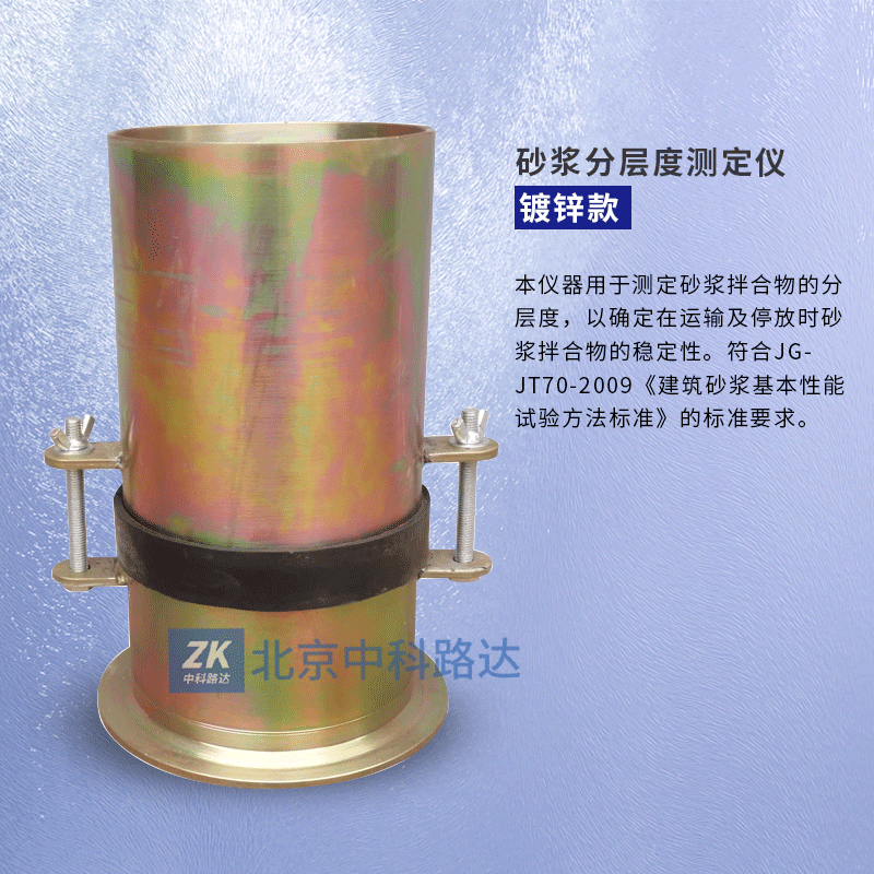 本儀器用于測(cè)定砂漿拌合物的分層度,以確定在運(yùn)輸及停放時(shí)砂漿拌合物的穩(wěn)定性。符合JGJT70-2009《建筑砂漿基本性能試驗(yàn)方法標(biāo)準(zhǔn)》的標(biāo)準(zhǔn)要求。