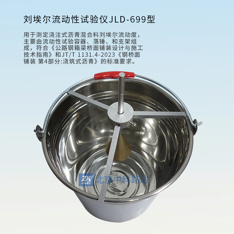 用于測(cè)定澆注式瀝青混合料劉埃爾流動(dòng)度,主要由流動(dòng)性試驗(yàn)容器、落錘、和支架組成,符合《公路鋼箱梁橋面鋪裝設(shè)計(jì)與施工技術(shù)指南》和JT/T 1131.4-2023《鋼橋面鋪裝 第4部分:澆筑式瀝青》的標(biāo)準(zhǔn)要求。