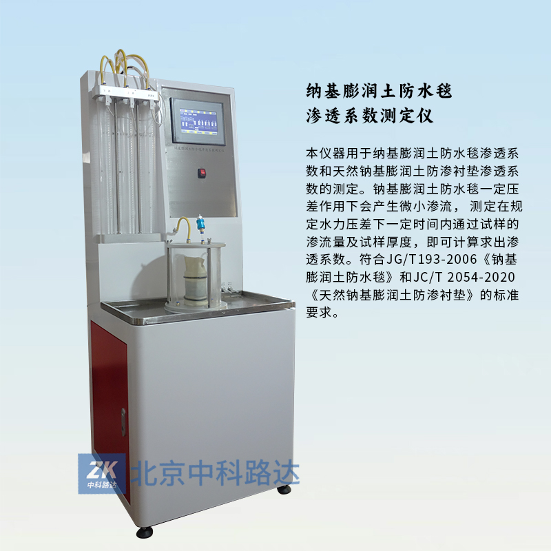 本儀器用于納基膨潤土防水毯滲透系數(shù)和天然鈉基膨潤土防滲襯墊滲透系數(shù)的測定。鈉基膨潤土防水毯一定壓差作用下會產(chǎn)生微小滲流, 測定在規(guī)定水力壓差下一定時間內(nèi)通過試樣的滲流量及試樣厚度,即可計算求出滲透系數(shù)。符合JG/T193-2006《鈉基膨潤土防水毯》和JC/T 2054-2020《天然鈉基膨潤土防滲襯墊》的標(biāo)準(zhǔn)要求。