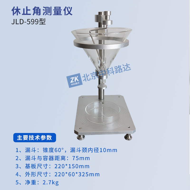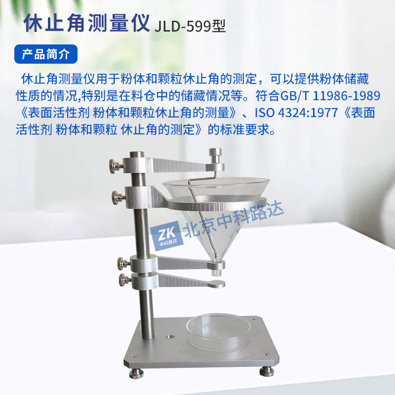 休止角測量儀用于粉體和顆粒休止角的測定,可以提供粉體儲藏性質(zhì)的情況,特別是在料倉中的儲藏情況等。符合GB/T 11986-1989《表面活性劑 粉體和顆粒休止角的測量》、ISO 4324:1977《表面活性劑 粉體和顆粒 休止角的測定》的標(biāo)準(zhǔn)要求。