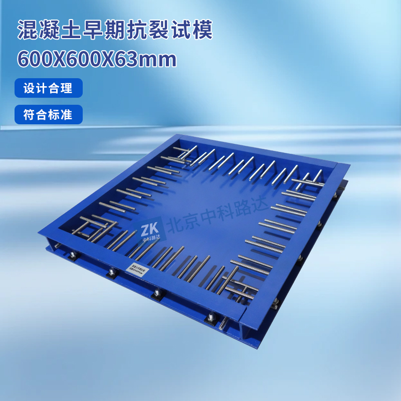 混凝土早期抗裂試模采用平板法測定水泥混凝土的早期開裂敏感性,測試水泥混凝土在約束條件下的早期抗裂性能。底座采用鋼板,四邊采用槽鋼,螺栓采用不銹鋼材質(zhì),尺寸標(biāo)準(zhǔn),拆裝方便。符合JTG3420-2020《公路工程水泥及水泥混凝土試驗規(guī)程》中T0573-2020水泥混凝土早期開裂敏感性試驗方法(平板法)和CCES 01-2004《混凝土結(jié)構(gòu)耐久性設(shè)計與施工指南》的標(biāo)準(zhǔn)要求。