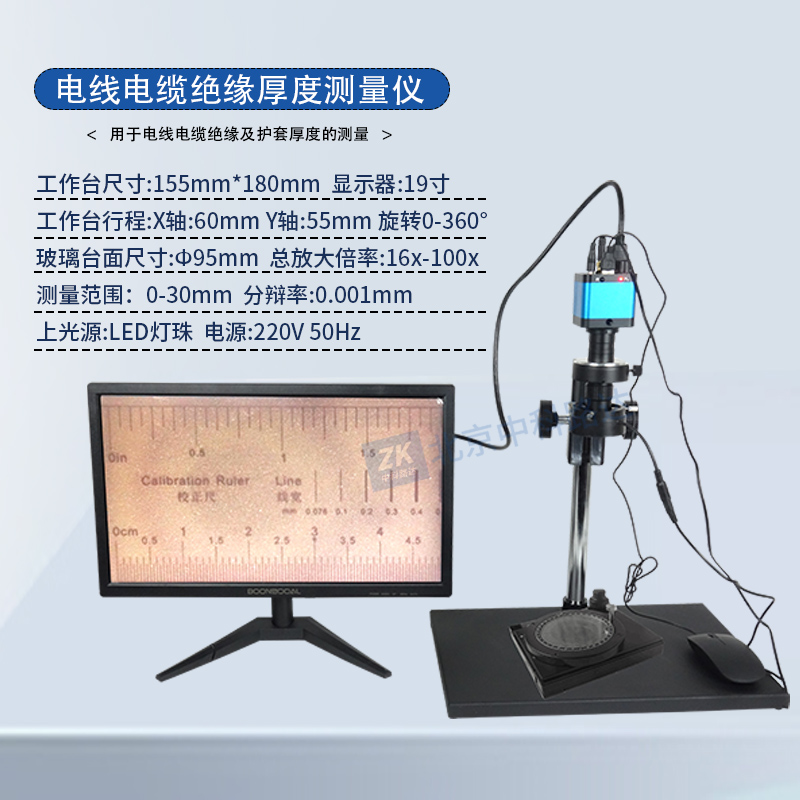 電線電纜絕緣厚度測量儀用于電線電纜絕緣及護(hù)套厚度的測量,是一種光電一體化的精密光學(xué)測量儀器,廣泛應(yīng)用于機(jī)械、儀表、電子、電纜、橡膠、塑料包裝、軸承等各行各業(yè)以及研究所、計(jì)量鑒定部門的計(jì)量室、實(shí)驗(yàn)室和生產(chǎn)車間。本儀器能高效地檢測各種形狀復(fù)雜工件的輪廓尺寸和表面形狀。符合 GB/T 2951.1-1997《電纜絕緣和護(hù)套材料通用試驗(yàn)方法 第1部分:通用試驗(yàn)方法 第1節(jié):厚度和外形尺寸測量---機(jī)械性能試驗(yàn)》的標(biāo)準(zhǔn)要求。