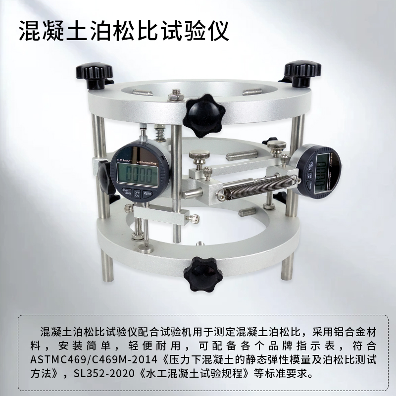 混凝土泊松比試驗儀配合試驗機(jī)用于測定混凝土泊松比,采用鋁合金材料,安裝簡單,輕便耐用,可配備各個品牌指示表,符合ASTMC469/C469M-2014《壓力下混凝土的靜態(tài)彈性模量及泊松比測試方法》,SL352-2020《水工混凝土試驗規(guī)程》等標(biāo)準(zhǔn)要求。