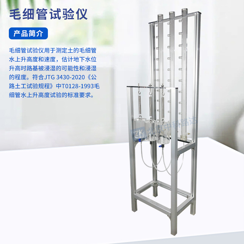 毛細(xì)管試驗儀用于測定土的毛細(xì)管水上升高度和速度,估計地下水位升高時路基被浸濕的可能性和浸濕的程度。符合JTG 3430-2020《公路土工試驗規(guī)程》中T0128-1993毛細(xì)管水上升高度試驗的標(biāo)準(zhǔn)要求。
