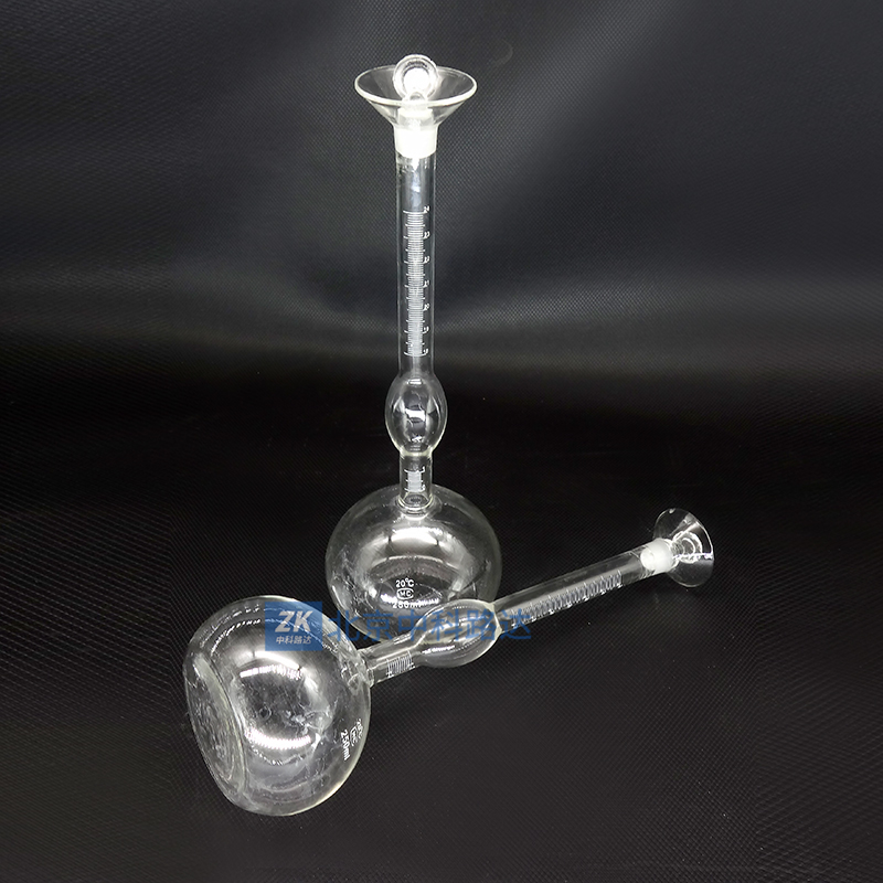 是一個(gè)細(xì)長(zhǎng)頸平底瓶,容積約250ml左右,瓶頸上口系喇叭形寬口,具磨砂玻璃塞,在瓶頸的中下部有一長(zhǎng)形球,瓶頸刻度容量約為24ml,刻度分為三段,從瓶頸下部開始,0-1ml,1-18ml(為瓶頸中部球容積),18-24ml...