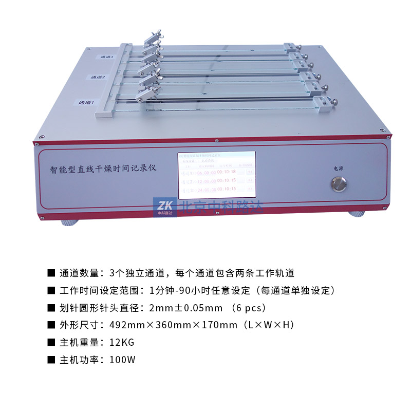 這是一款功能強大的智能型的直線干燥時間記錄儀,可以滿足不同干燥時間特性的樣品的全面分析。帶半球型觸點的劃桿安裝在滑架上。劃桿由滑架帶動,與新涂膜層接觸,由一端開始,在試樣上作縱向移動??赏ㄟ^儀器的“軌跡查詢”功能查看對應(yīng)軌跡的各個干燥階段。它有三個可以單獨設(shè)定任意運行時間的通道(每個通道有兩條工作軌道),符合ASTM D 5895的標準要求。
