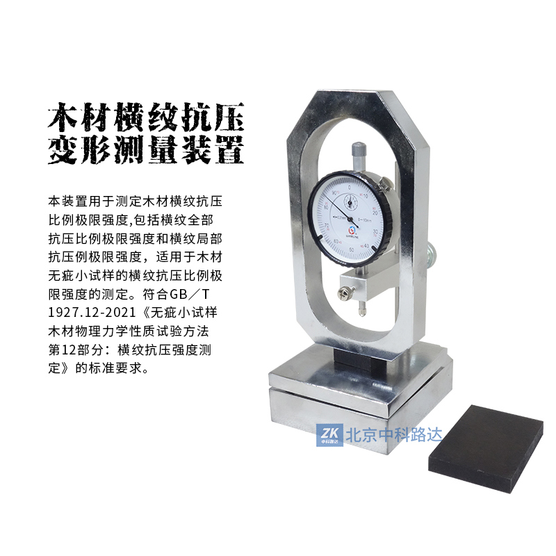 本裝置用于測定木材橫紋抗壓比例極限強度,包括橫紋全部抗壓比例極限強度和橫紋局部抗壓例極限強度,適用于木材無疵小試樣的橫紋抗壓比例極限強度的測定。符合GB∕T 1927.12-2021《無疵小試樣木材物理力學(xué)性質(zhì)試驗方法 第12部分:橫紋抗壓強度測定》的標(biāo)準(zhǔn)要求。