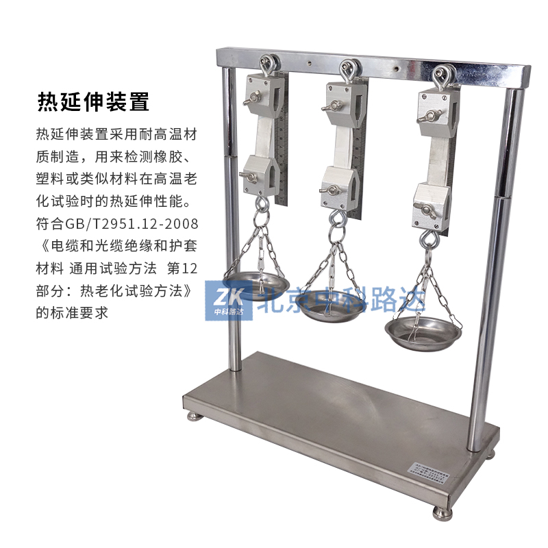 熱延伸裝置采用耐高溫材質(zhì)制造,用來(lái)檢測(cè)橡膠、塑料或類(lèi)似材料在高溫老化試驗(yàn)時(shí)的熱延伸性能。符合GB/T2951.12-2008《電纜和光纜絕緣和護(hù)套材料 通用試驗(yàn)方法 第12部分:熱老化試驗(yàn)方法》的標(biāo)準(zhǔn)要求。采用鋁合金波紋夾具,夾持方便牢固;不銹鋼直尺,刻度清晰;多種配重砝碼,自由組合。