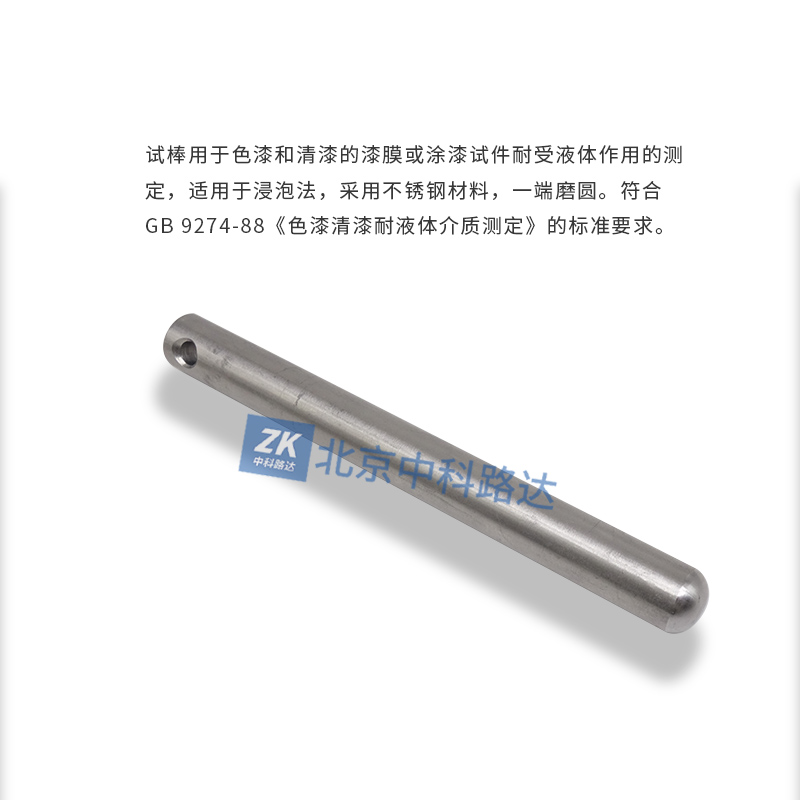 試棒用于色漆和清漆的漆膜或涂漆試件耐受液體作用的測定,適用于浸泡法,采用不銹鋼材料,一端磨圓。符合GB 9274-88《色漆清漆耐液體介質(zhì)測定》的標(biāo)準要求。