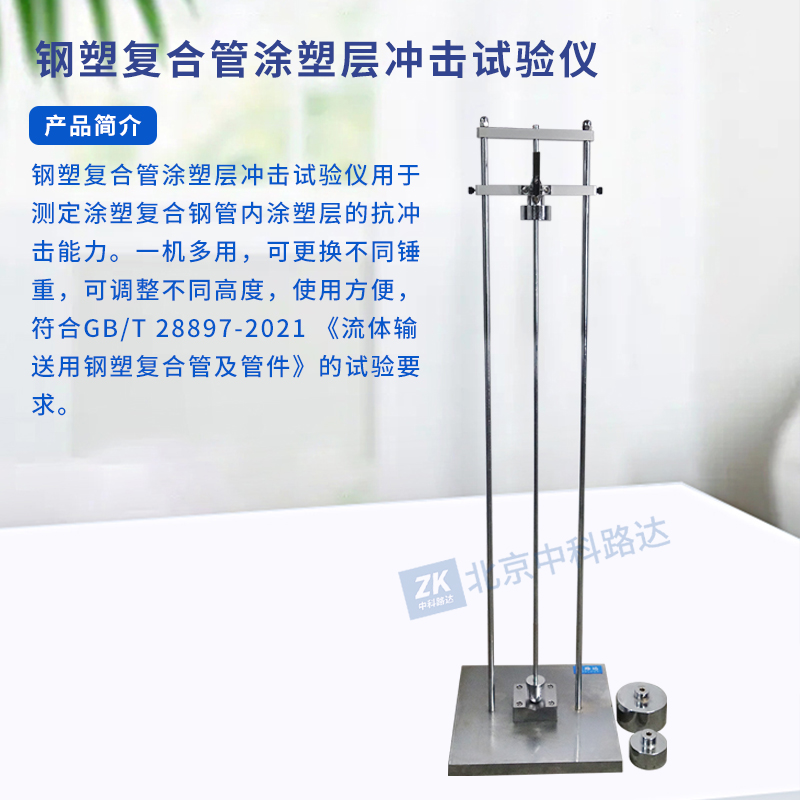 鋼塑復(fù)合管涂塑層沖擊試驗(yàn)儀用于測(cè)定涂塑復(fù)合鋼管內(nèi)涂塑層的抗沖擊能力。一機(jī)多用,可更換不同錘重,可調(diào)整不同高度,使用方便,符合GB/T 28897-2021 《流體輸送用鋼塑復(fù)合管及管件》的試驗(yàn)要求。