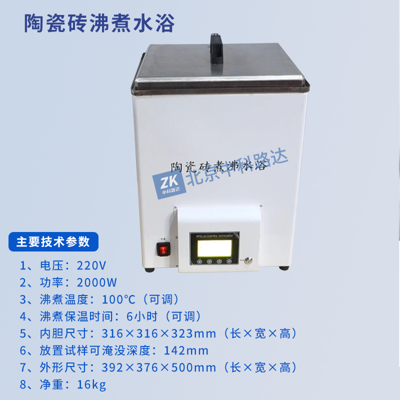 陶瓷磚沸煮水浴采用煮沸法對陶瓷磚,日用陶瓷、建筑衛(wèi)生陶瓷、電瓷的吸水率進行測定。也可用于磚瓦、水泥制品等的吸水率測定。主控芯片采用微處理器,全過程自動化控制,也可以手動設(shè)置操作,操作簡單。主機采用不銹鋼內(nèi)膽及優(yōu)質(zhì)保溫棉制造,具有水位設(shè)置,自動補水,持續(xù)煮沸,防止干燒等功能,并可任意設(shè)置溫度,恒溫時間,水位高度。滿足GB/T 3810.3-2016《陶瓷磚試驗方法第3部分 :吸水率、顯氣孔率、表觀相對密度和容重的測定》、GB/T 3299-2011《日用陶瓷器吸水率測定方法》等標準要求。