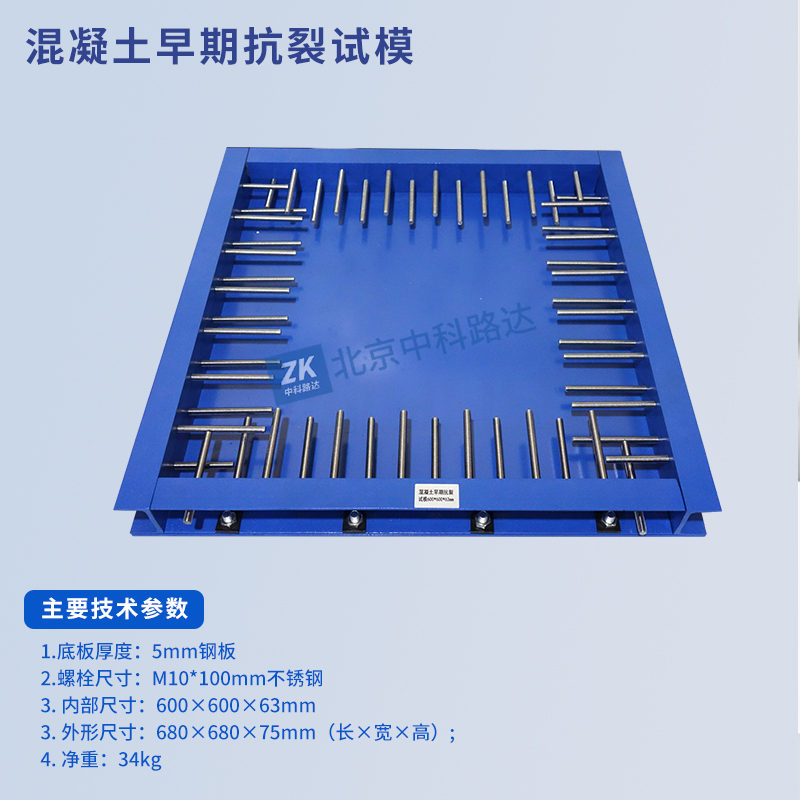 混凝土早期抗裂試模采用平板法測定水泥混凝土的早期開裂敏感性,測試水泥混凝土在約束條件下的早期抗裂性能。底座采用鋼板,四邊采用槽鋼,螺栓采用不銹鋼材質(zhì),尺寸標(biāo)準(zhǔn),拆裝方便。符合JTG3420-2020《公路工程水泥及水泥混凝土試驗規(guī)程》中T0573-2020水泥混凝土早期開裂敏感性試驗方法(平板法)和CCES 01-2004《混凝土結(jié)構(gòu)耐久性設(shè)計與施工指南》的標(biāo)準(zhǔn)要求。