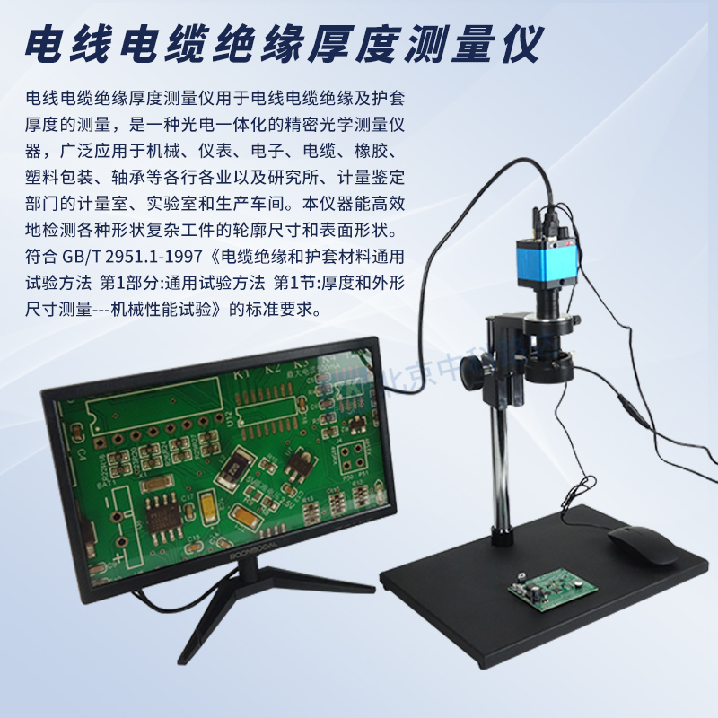 電線電纜絕緣厚度測量儀用于電線電纜絕緣及護(hù)套厚度的測量,是一種光電一體化的精密光學(xué)測量儀器,廣泛應(yīng)用于機(jī)械、儀表、電子、電纜、橡膠、塑料包裝、軸承等各行各業(yè)以及研究所、計(jì)量鑒定部門的計(jì)量室、實(shí)驗(yàn)室和生產(chǎn)車間。本儀器能高效地檢測各種形狀復(fù)雜工件的輪廓尺寸和表面形狀。符合 GB/T 2951.1-1997《電纜絕緣和護(hù)套材料通用試驗(yàn)方法 第1部分:通用試驗(yàn)方法 第1節(jié):厚度和外形尺寸測量---機(jī)械性能試驗(yàn)》的標(biāo)準(zhǔn)要求。