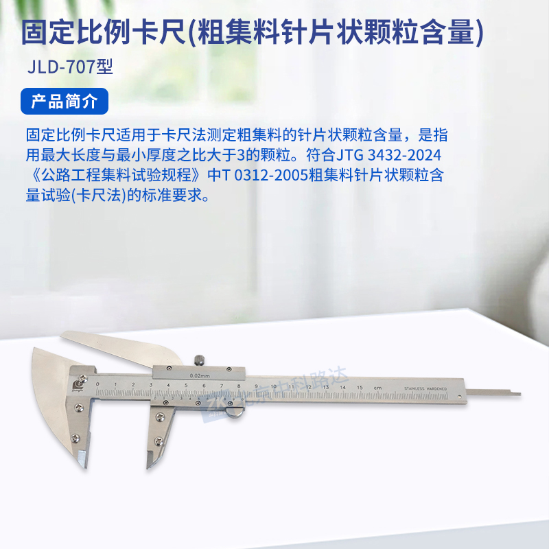 固定比例卡尺適用于卡尺法測定粗集料的針片狀顆粒含量,是指用最大長度與最小厚度之比大于3的顆粒。符合JTG 3432-2024《公路工程集料試驗規(guī)程》中T 0312-2005粗集料針片狀顆粒含量試驗(卡尺法)的標準要求。...